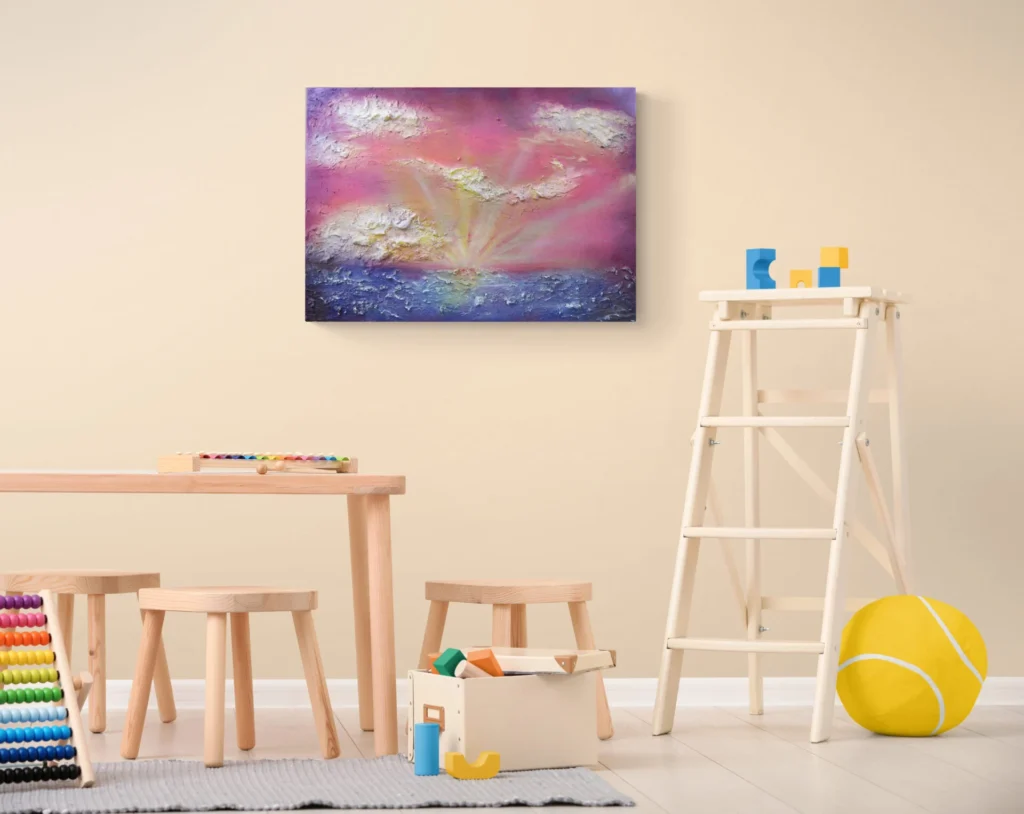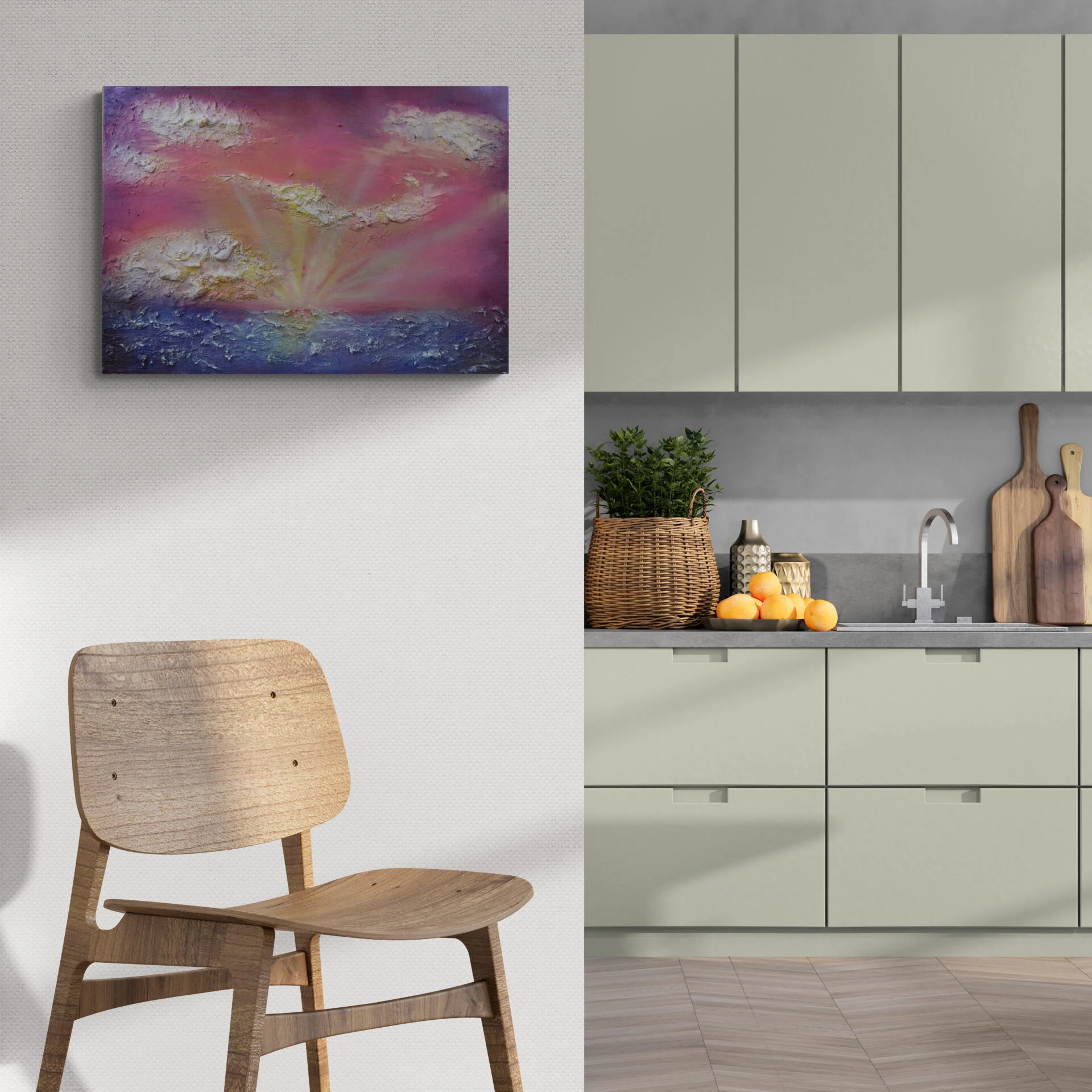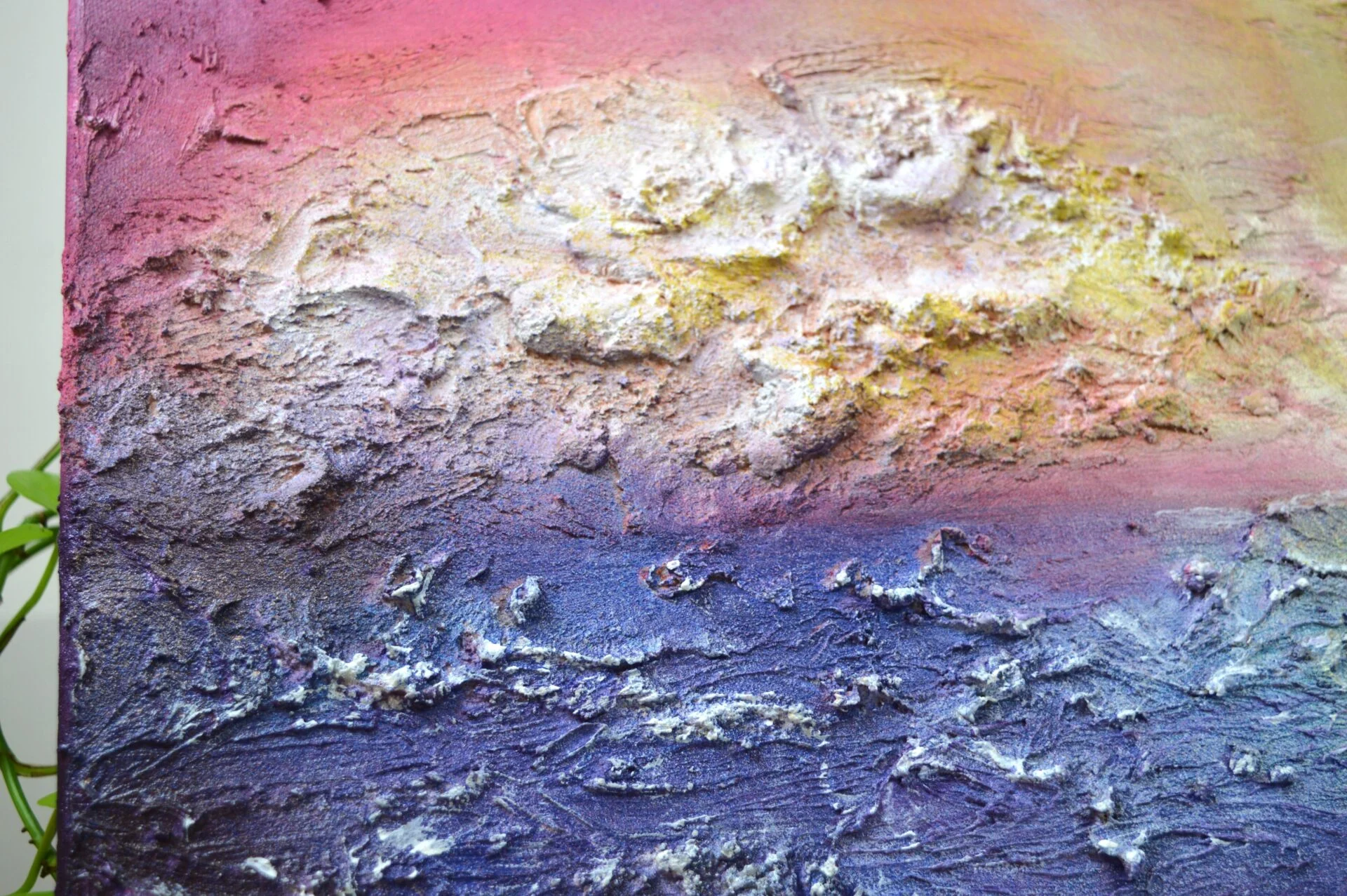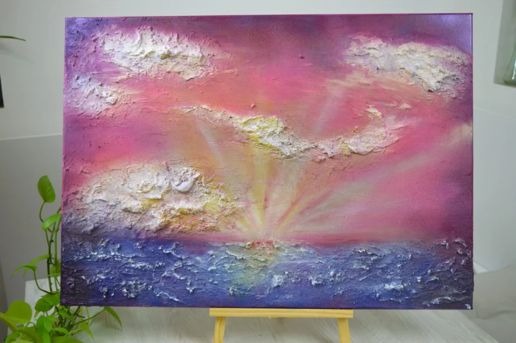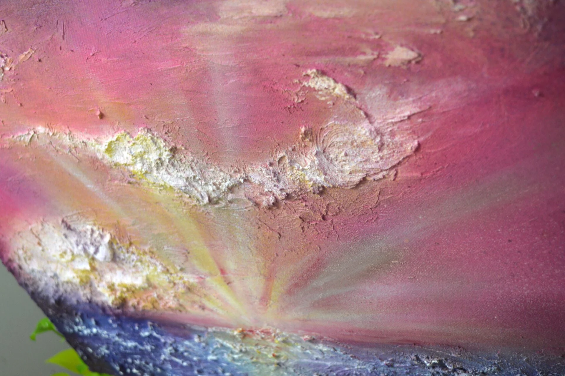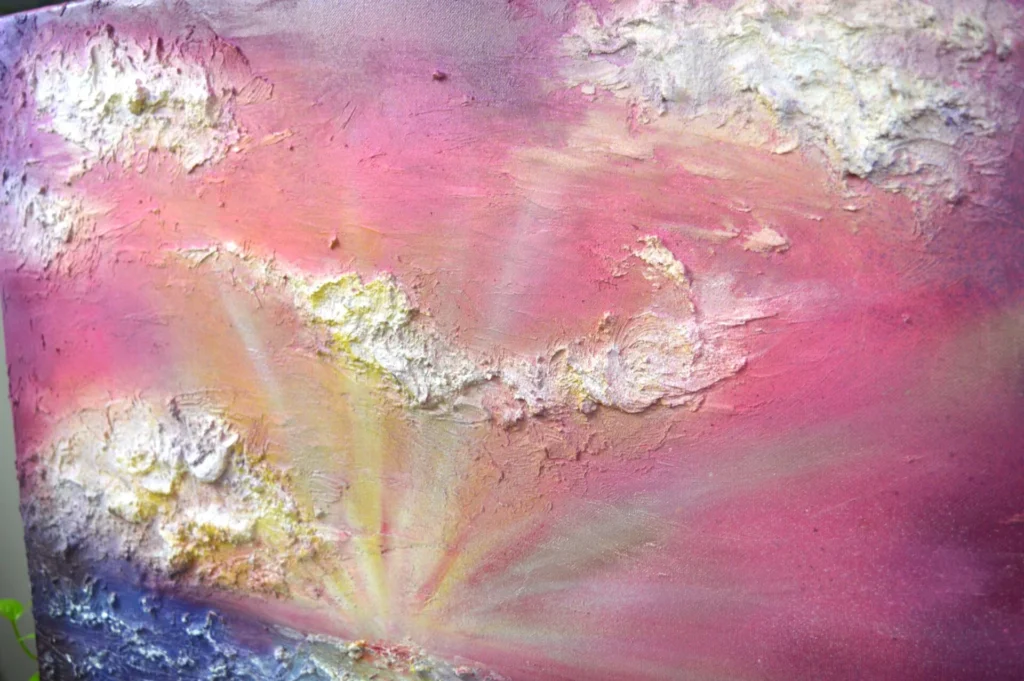 A rózsaszín és aranyló felhők a remény szavaiként lebegnek az égen, míg a varázslatos, lilás árnyalatú víz a tudatalatti mélységeit idézi, ahol minden fájdalom és emlék végül elcsitul. A napfény sugarai, áttörnek a felhőkön, így a hit és a megújulás metaforái: azt üzenik, hogy bármilyen hosszú is volt az éjszaka, a hajnal mindig megérkezik.